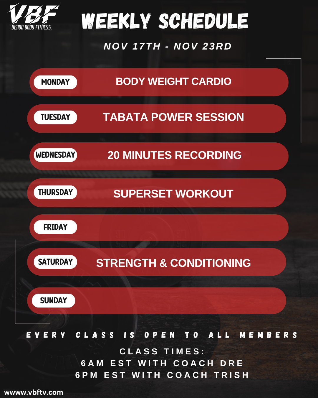 Live class schedule for the week of Nov 17th